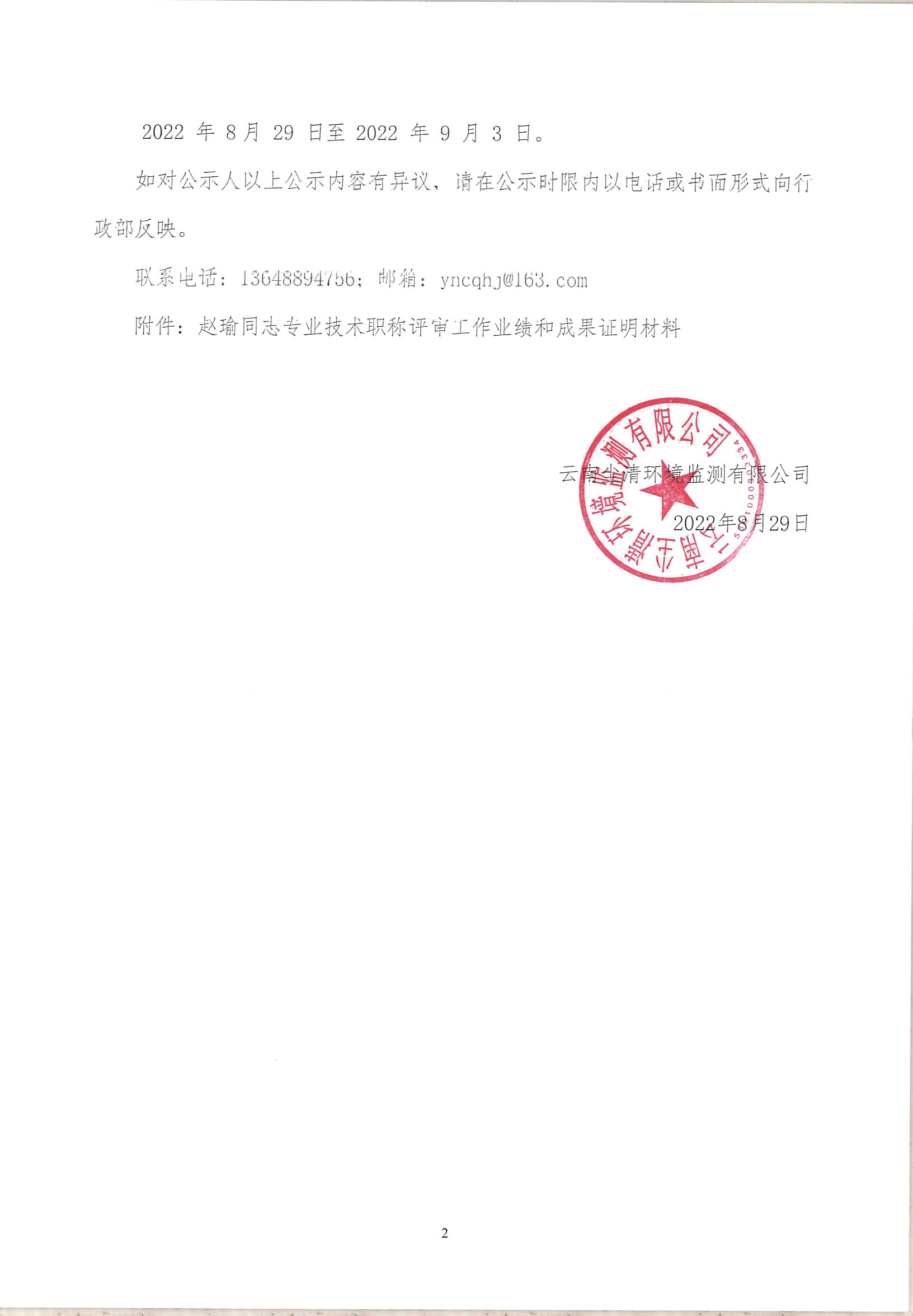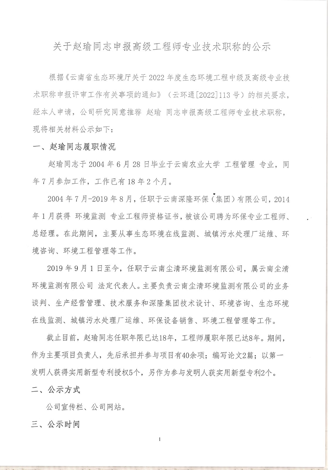 關于趙瑜同志申報高級工程師專業技術職稱的公示(公示時間:2022年8月29日至9月3日)
